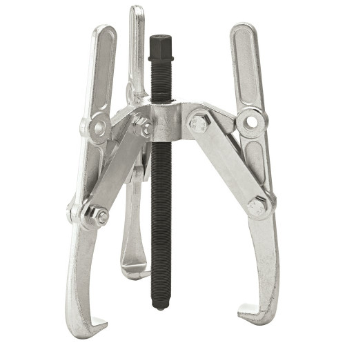 Drie-armig, met zwenkbare, in lengte verstelbare trekhaken, voor grote spanbereiken, verzinkt; voor het lostrekken van tandwielen, kogellagers, v-riempoelies en soortgelijke delen van een as of aandrijfas; te gebruiken als buiten- en binnentrekker; voor gebruik als binnentrekker moeten de haken worden gezwenkt en de spindel omgedraaid; de grote hefboomwerking zorgt voor een vaste zit op het los of uit te trekken deel.